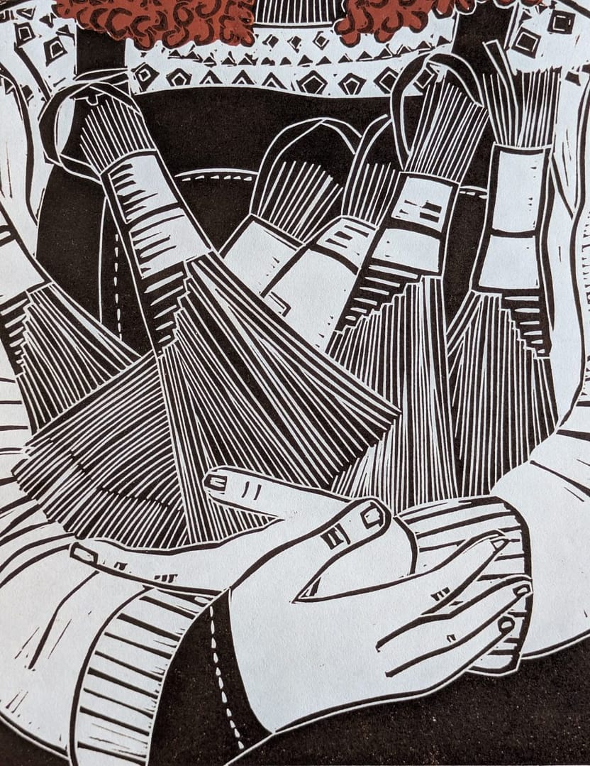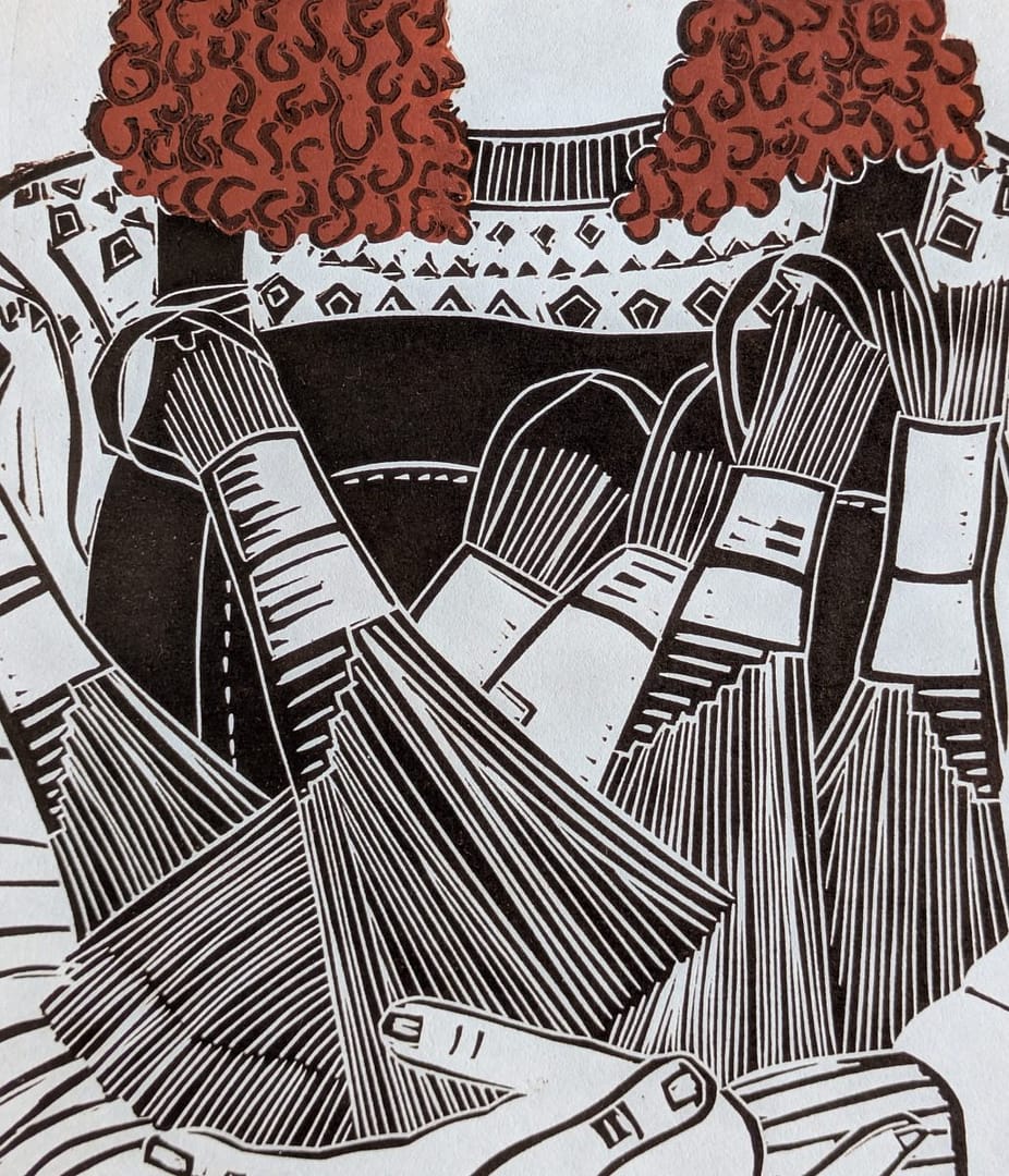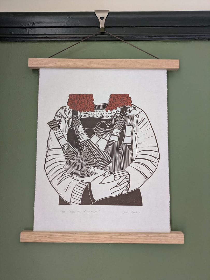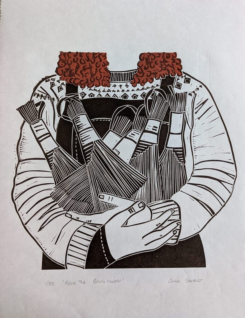 Rosa The Brush Maker is part of a series of lino prints I have been working on, featuring artisans who make beautiful items with their hands.